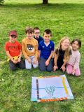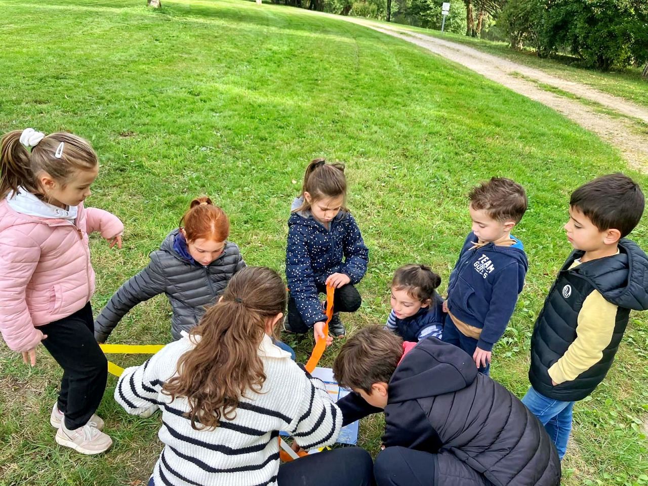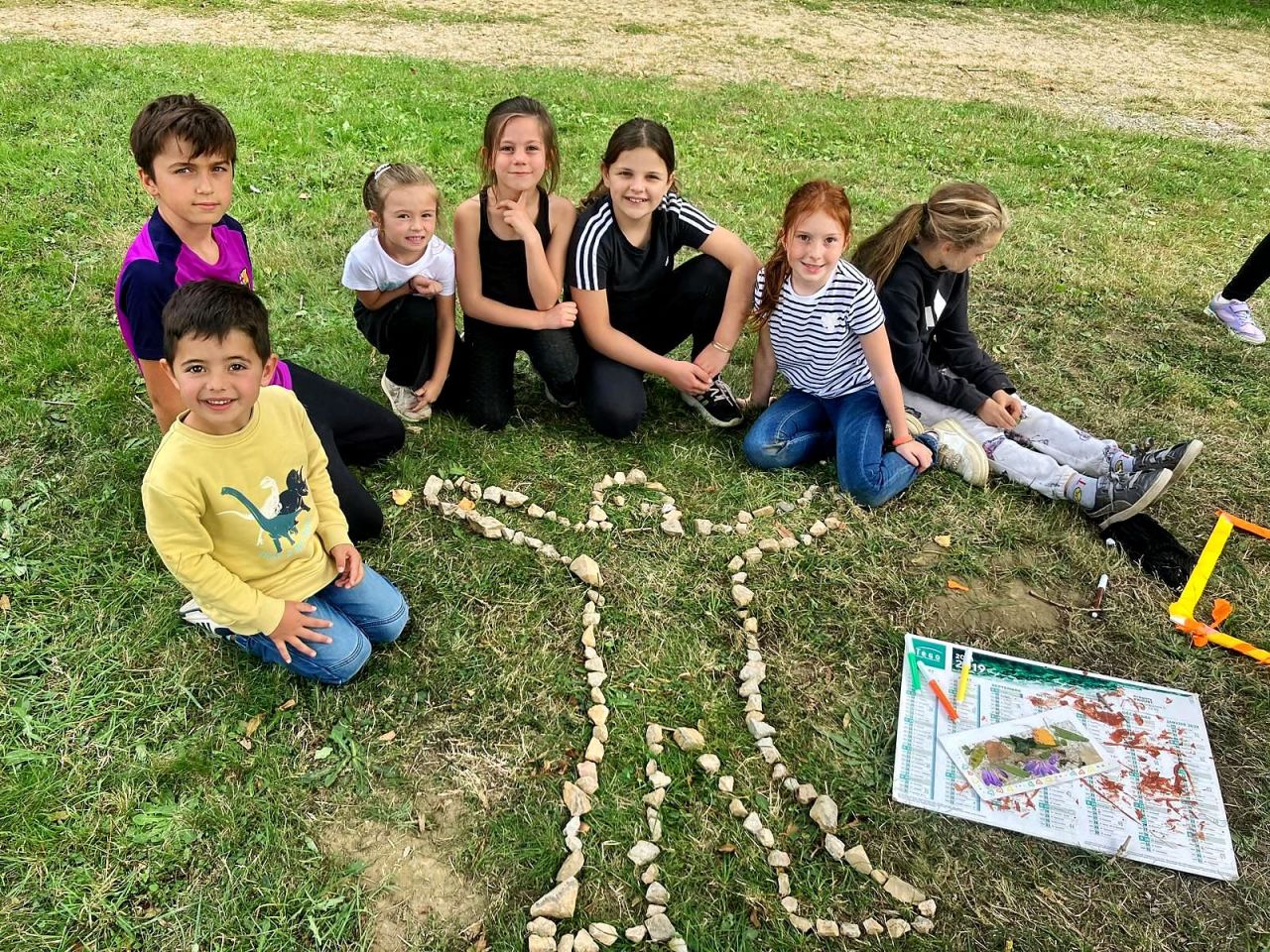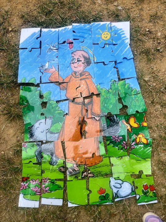 L’après-midi, les enfants ont poursuivi la fête à l’extérieur, à travers des défis autour de la nature : land art, construction de tipis, dessins, acrostiches, imitations d’animaux ou encore silhouettes. À chaque défi réussi, une équipe remportait une pièce de puzzle. L’objectif final était de rassembler toutes ces pièces pour reconstruire, tous ensemble, un puzzle géant représentant saint François.